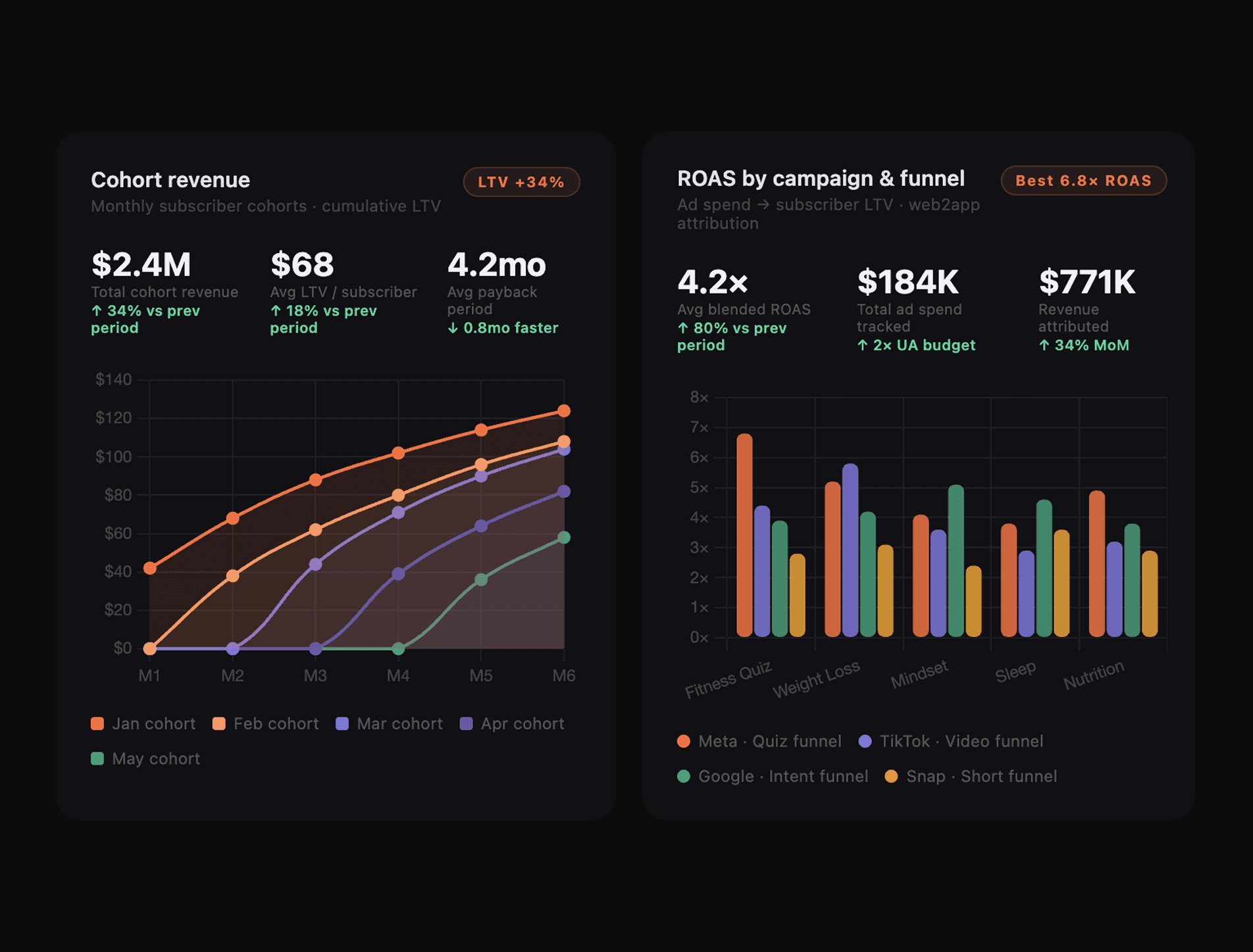 Build and launch web2app funnels, integrate payments, optimize