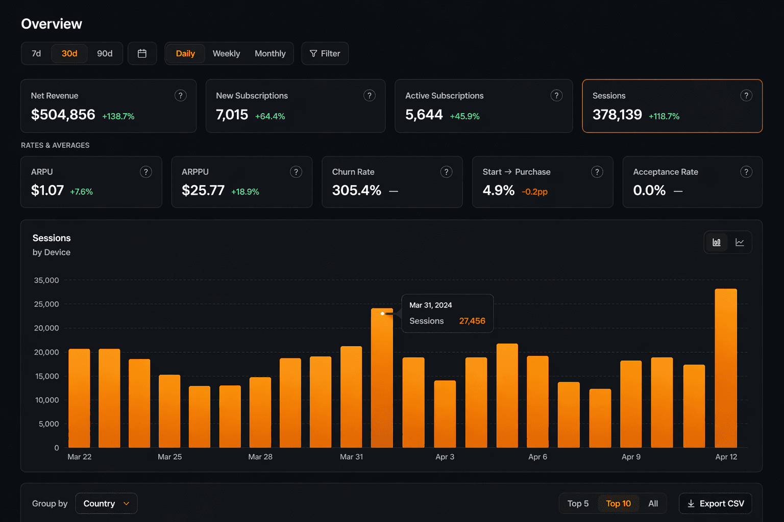 Pre-configured charts for your core metrics — Total Revenue, ARPU, ARPPU, ROAS, and conversion rates at every funnel stage — load instantly with zero setup. Apply filters, pick a time range, and see how you're doing right now.