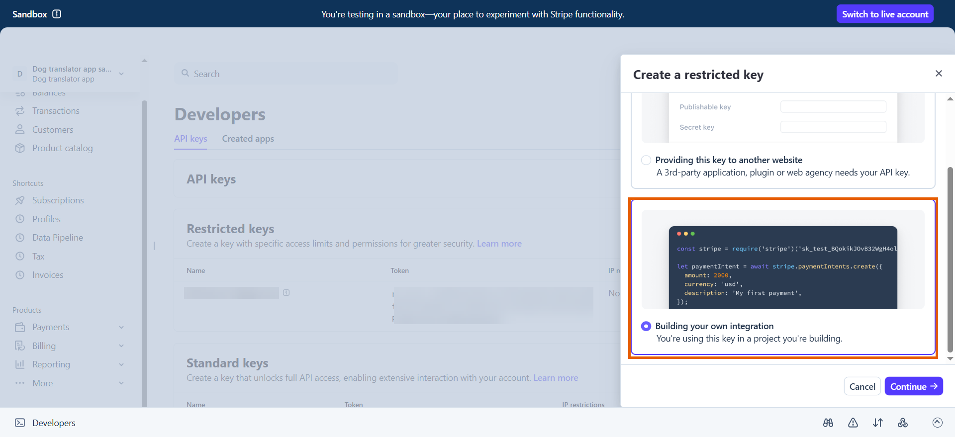 - Select Building your own integration and click Continue.
