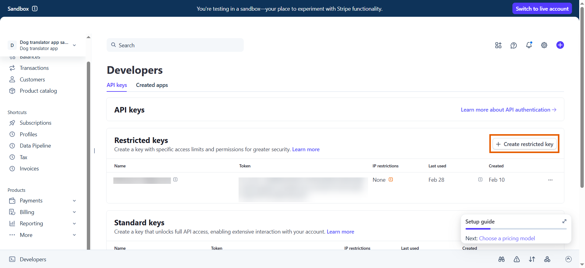 - Click + Create restricted key.