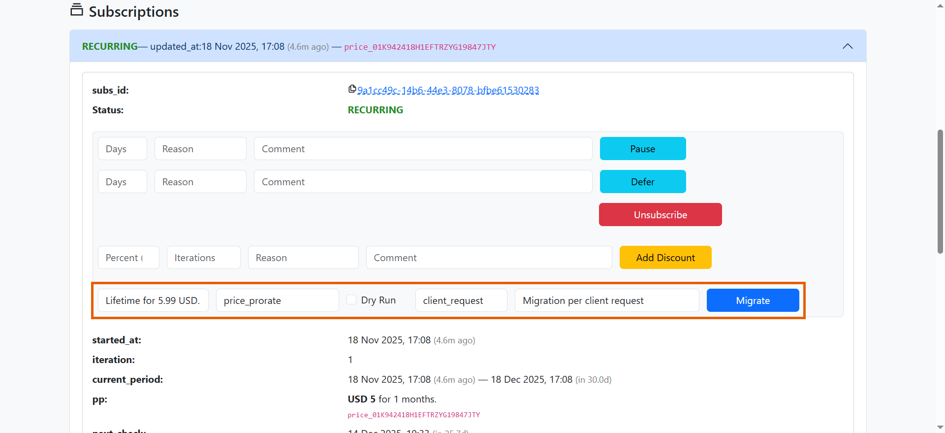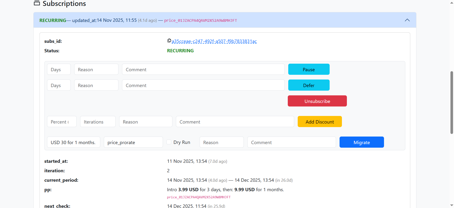 Defer subscription postpones the next charge date. This is useful when a user could not use the app and you want to compensate them for that time.The next payment date is pushed forward, giving the user free access for a set period. This helps maintain customer loyalty without issuing refunds or manually extending subscriptions.