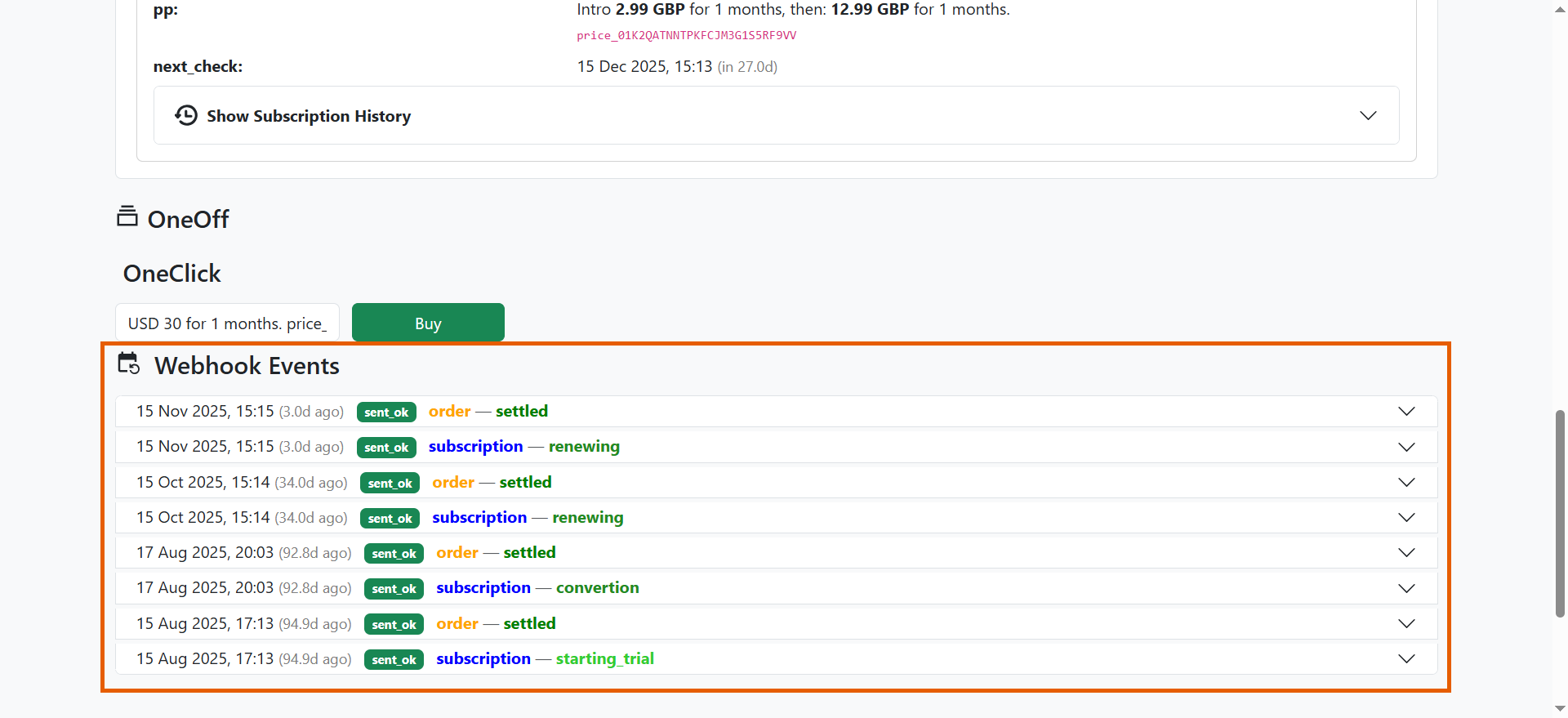 Track all subscription status changes to maintain your own analytics and stay up-to-date on user activity. Each status change creates an event that you can view in two places:- In the Webhook Events section on the user’s information page in the Support Tool.