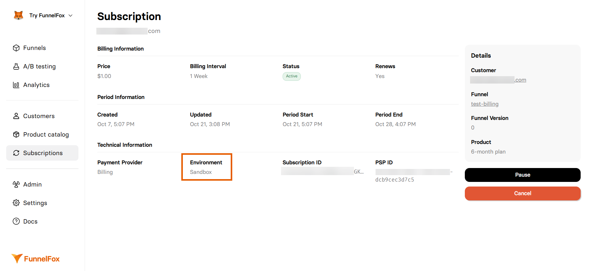 Look for Sandbox badges in the dashboard Subscriptions page when using test