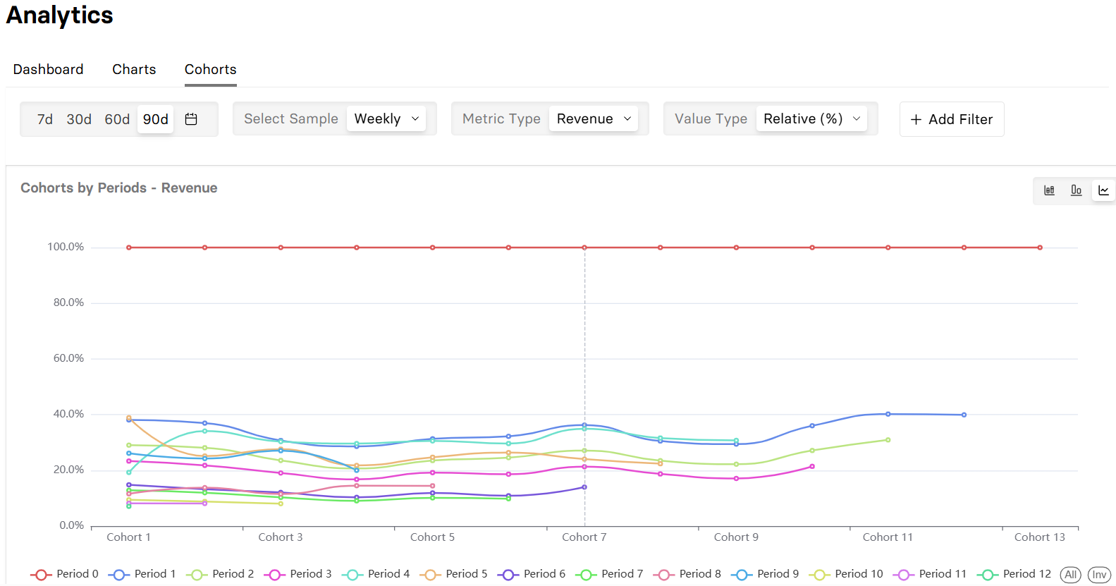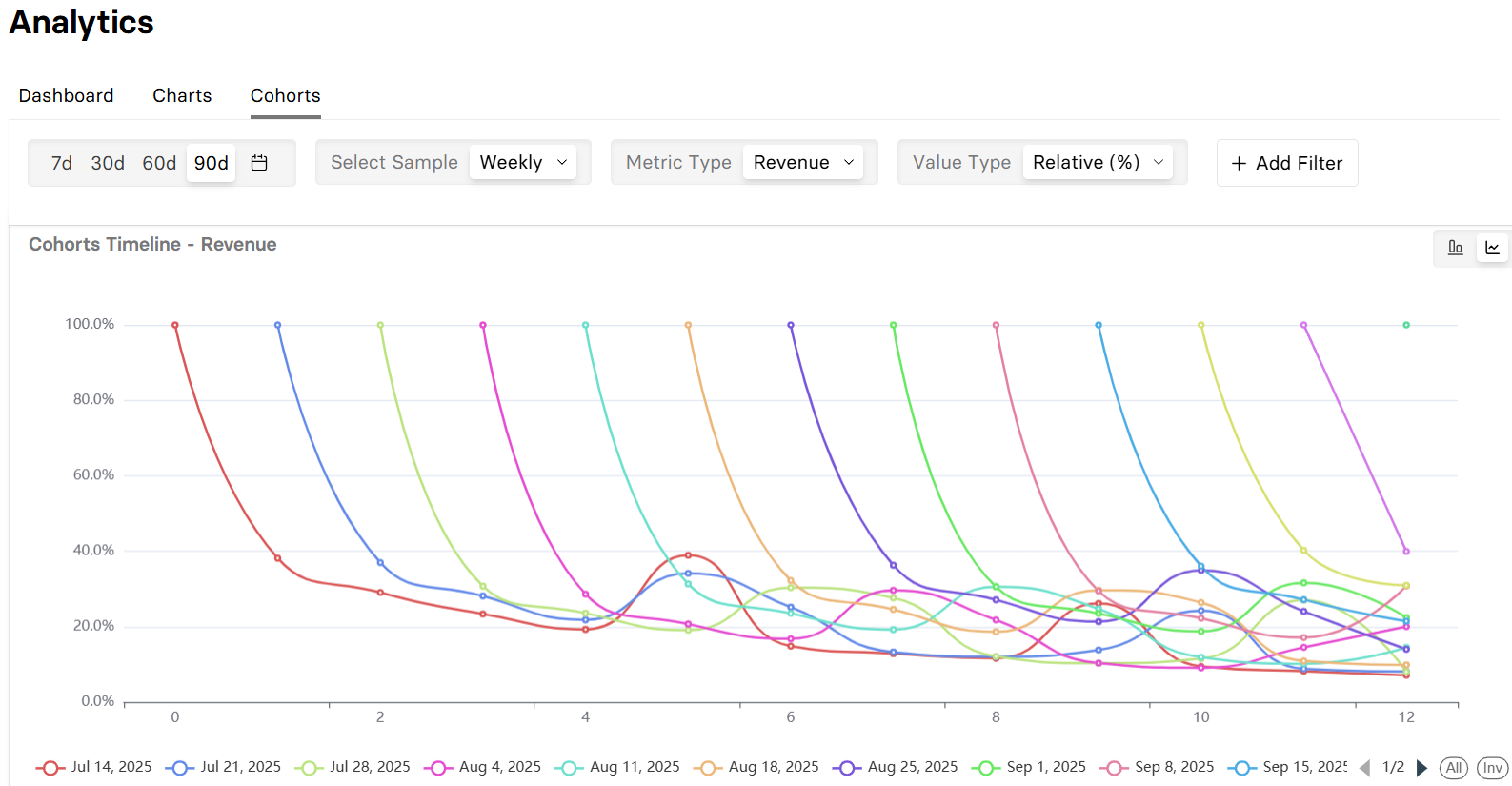 Shows each cohort from its launch and aligns their timelines (Week/Month 1, 2, 3…). Use this to see how subscriptions or revenue for each cohort change over time and spot retention/renewal trends.
