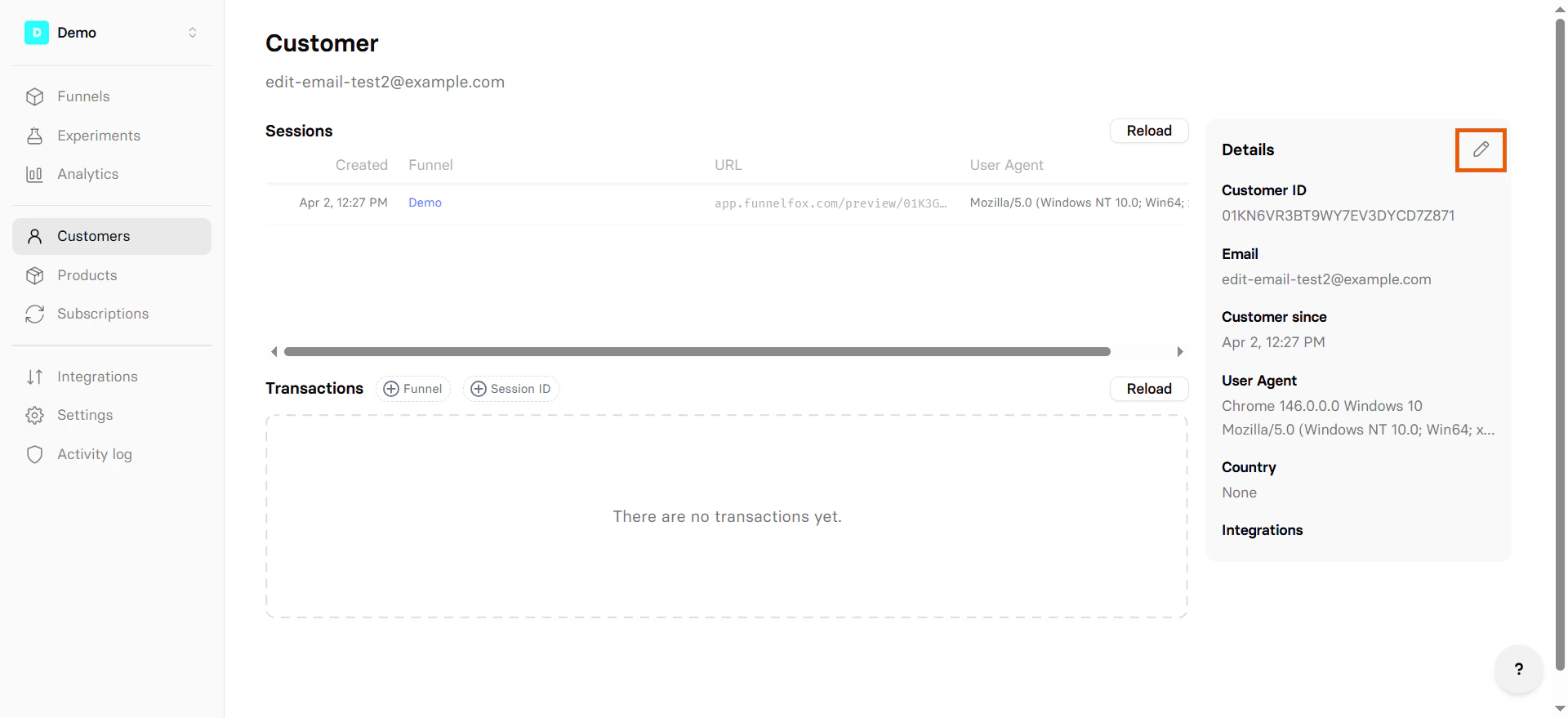 The details sidebar shows comprehensive customer data:The unique identifier for this profile. Use this when working with