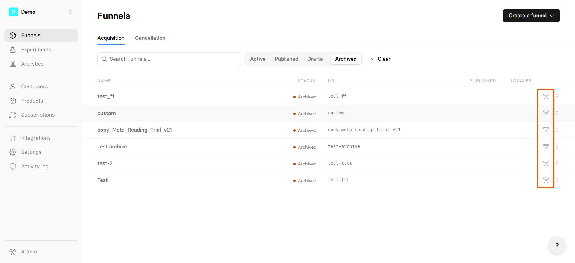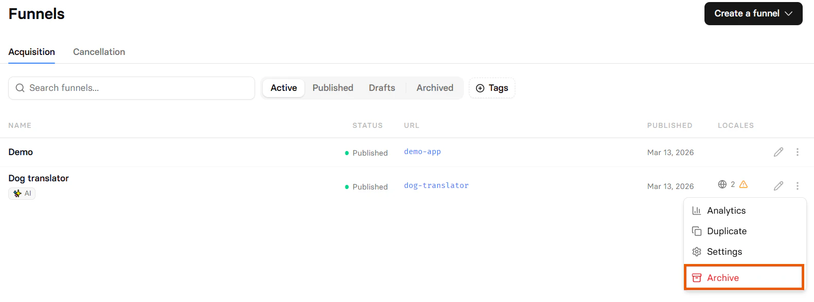 - Archive: Remove the funnel from your Funnels list and make both its preview and public URLs unavailable.