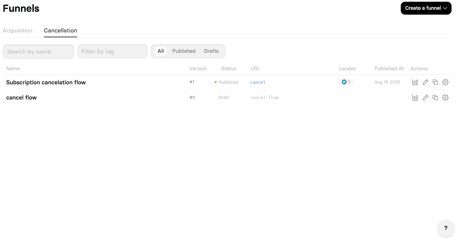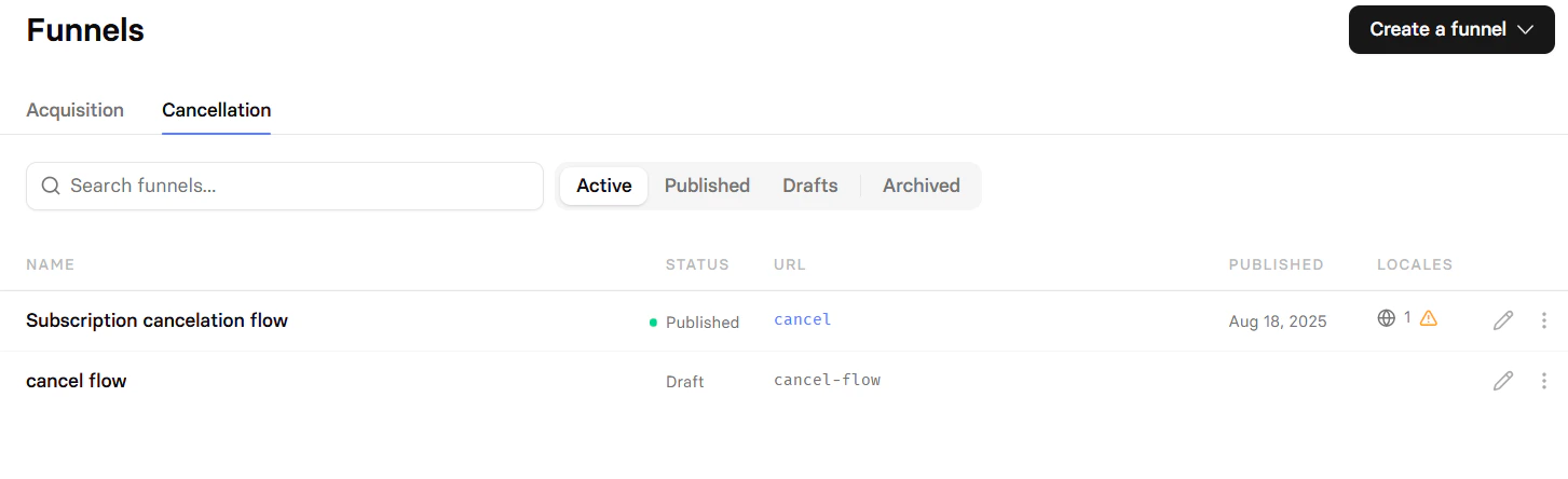 Publishing makes your funnel live and accessible to visitors. Draft funnels remain private until published. You can edit published funnels and republish them — this creates a new version that immediately replaces the previous one. Learn more about publishing funnels.Cancellation funnels