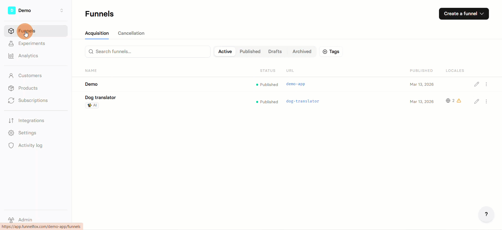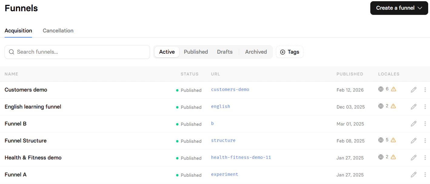 The Funnels page has two tabs: Acquisition and Cancellation. Both funnel types use the same editor and features but serve different purposes in your customer journey. You can quickly search funnels by their name, URL, or ID.- Acquisition