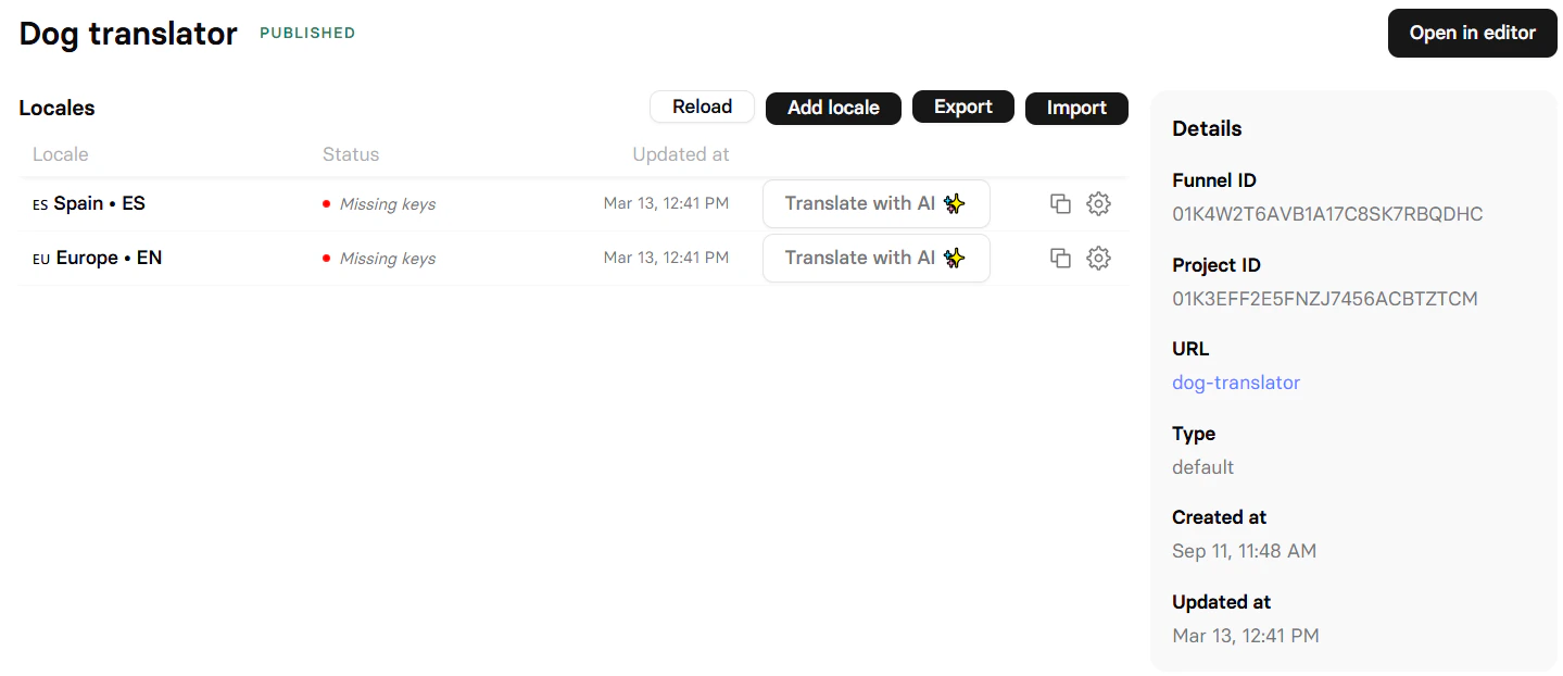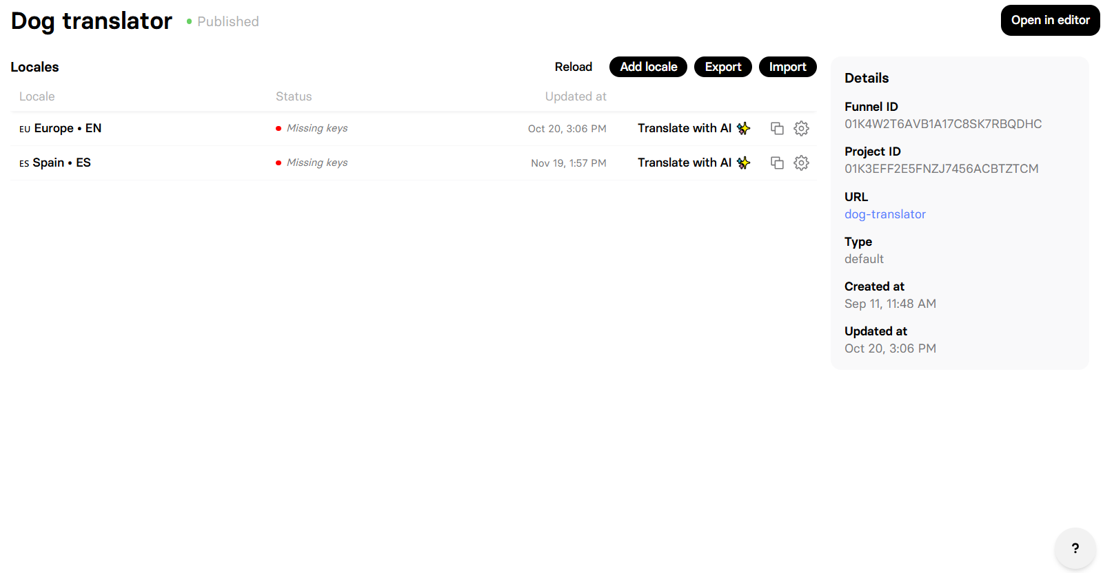 - Check locale status for missing translation keys that need updating with Translate with AI.