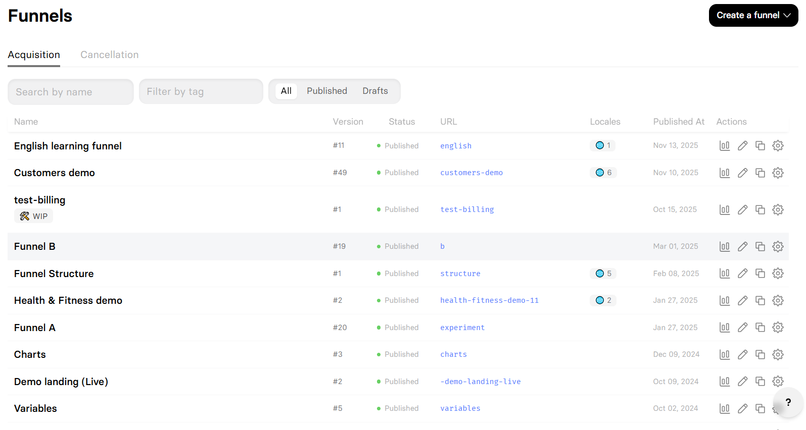 The Funnels page has two tabs: Acquisition and Cancellation. Both funnel types use the same editor and features but serve different purposes in your customer journey.- Acquisition