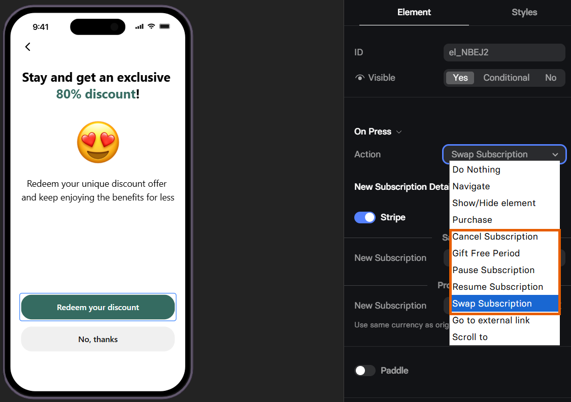 If you’d like to offer customers a discounted alternative instead of a full cancellation, you can configure a subscription swap. Because PSPs handle this differently, the resulting flow depends on the provider:- Stripe