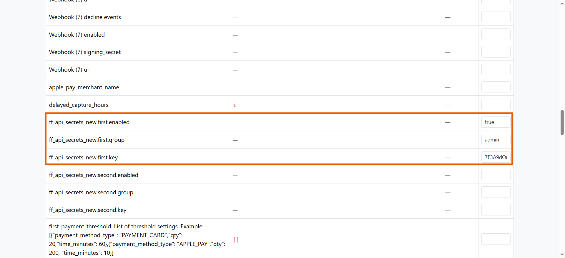 trueto enable the secret key. - ff_api_secrets_new.first.group: Set to