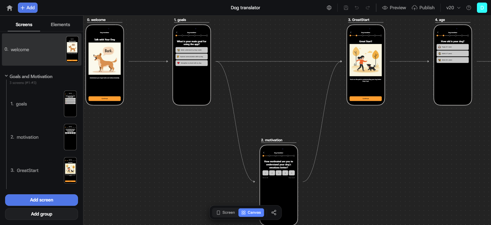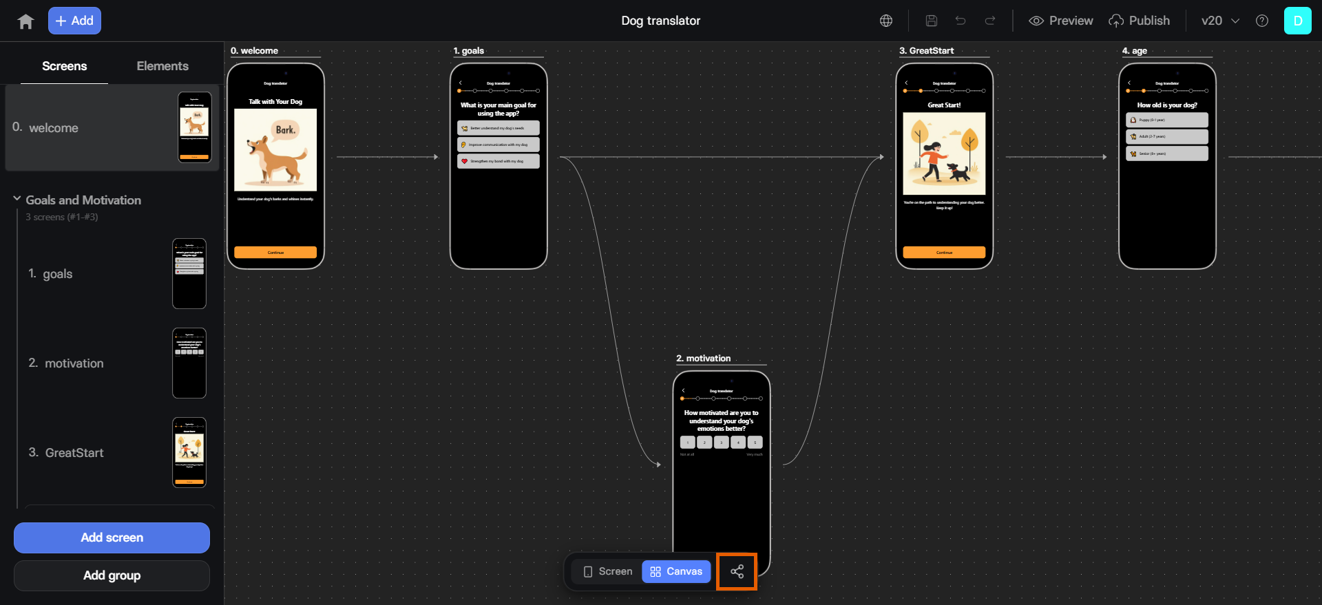 Groups organize screens and enable progress tracking: Organization- Group related screens (e.g., “Quiz Questions”, “Checkout Flow”)