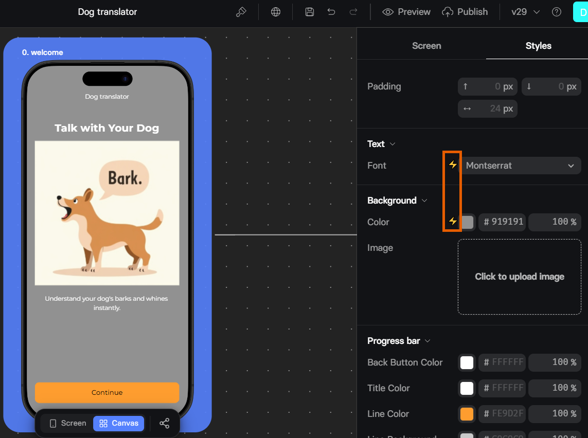 You can have style settings for a specific element different from those set in the global theme. To override the theme settings, edit the Style tab for the element directly. When you override theme settings:- The Style tab setting you override is marked with the ⚡ lightning icon.