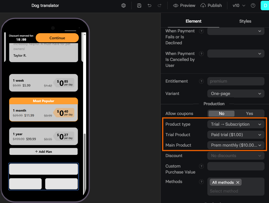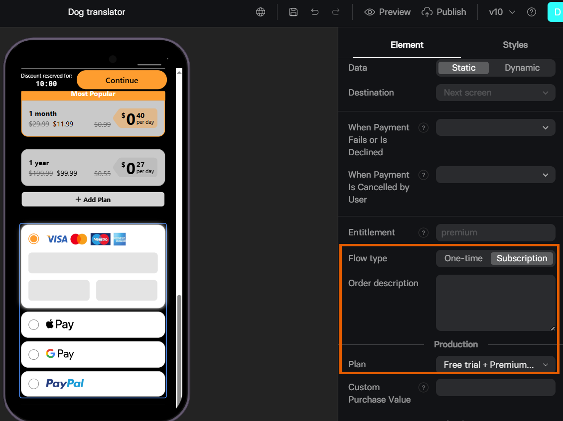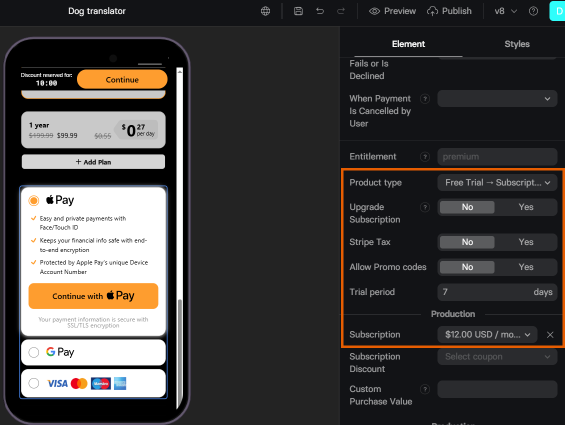 Regardless of which you integrated with FunnelFox, all subscriptions in your funnels are configured through the Element tab of the Checkout. While editing the Payment Provider Settings section, you can configure:Free trial