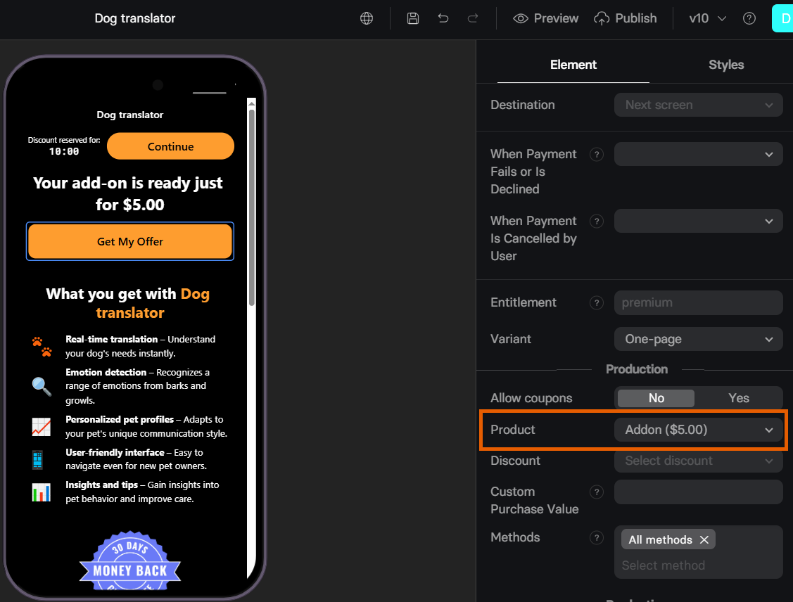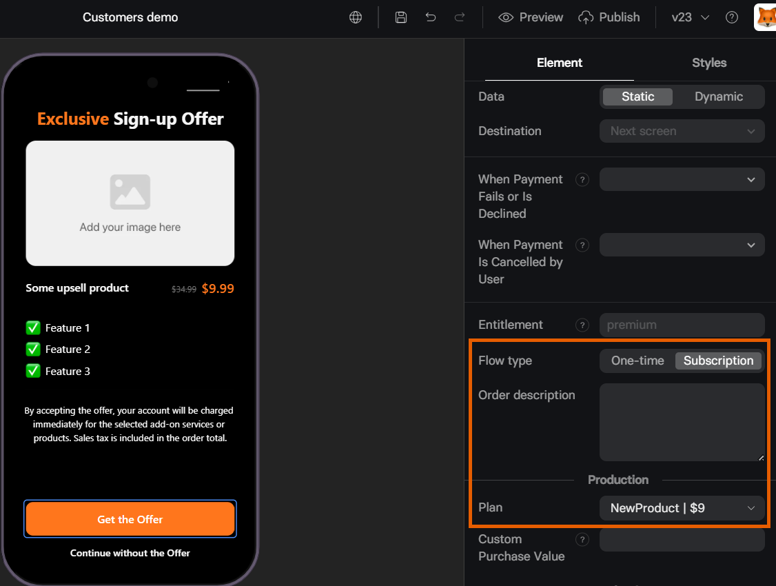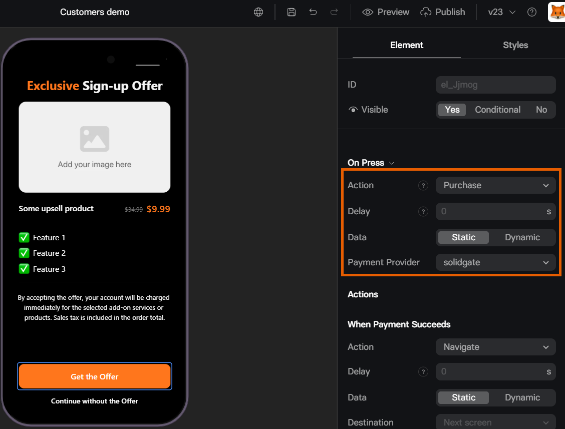 - Add a Button element to your upsell screen.