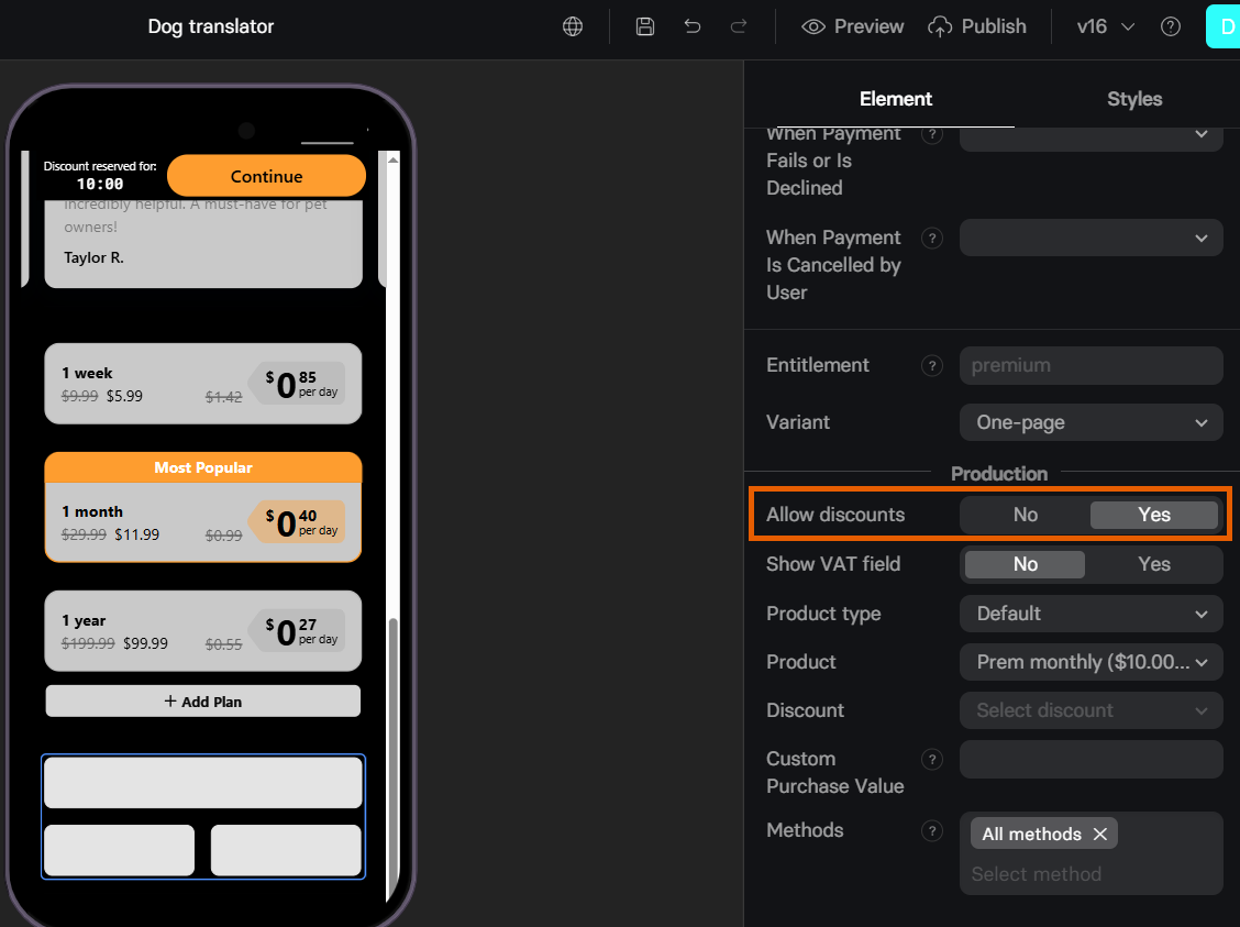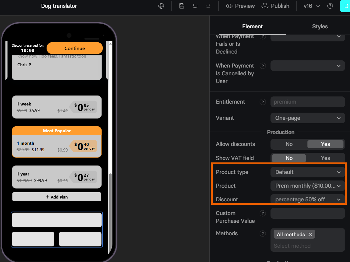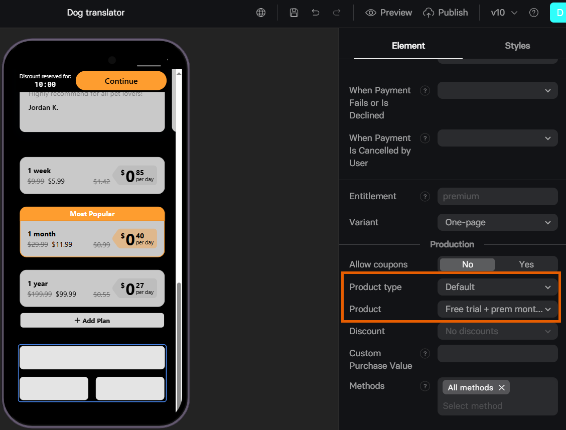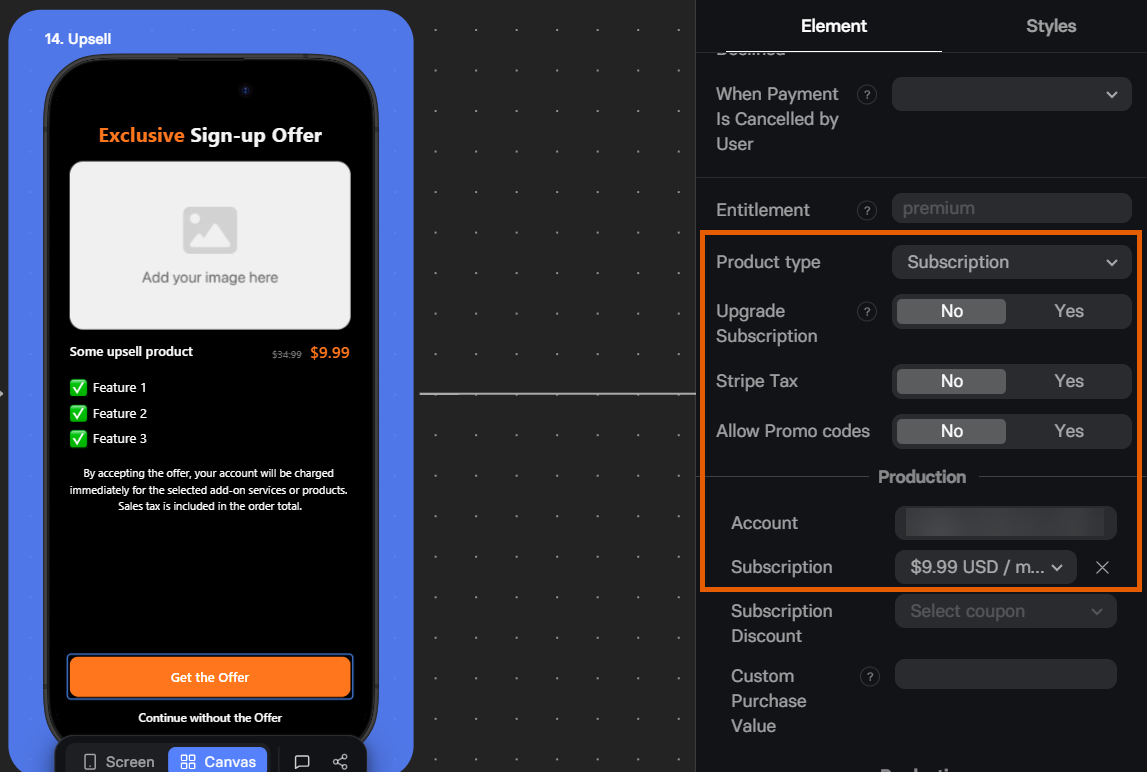 - Subscription/Intro discount: Define the Stripe coupon to apply.