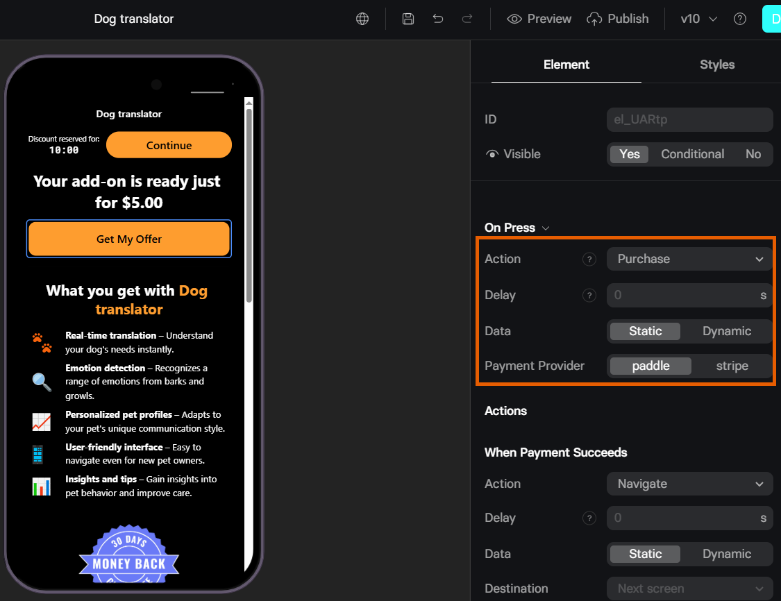 - Set up the On Press section of the Element tab: