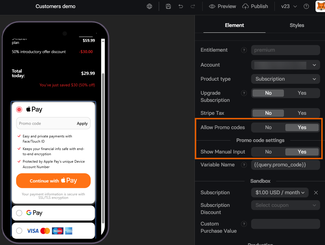- Allow promo codes: Enables promo code settings. Learn about promo codes setup.