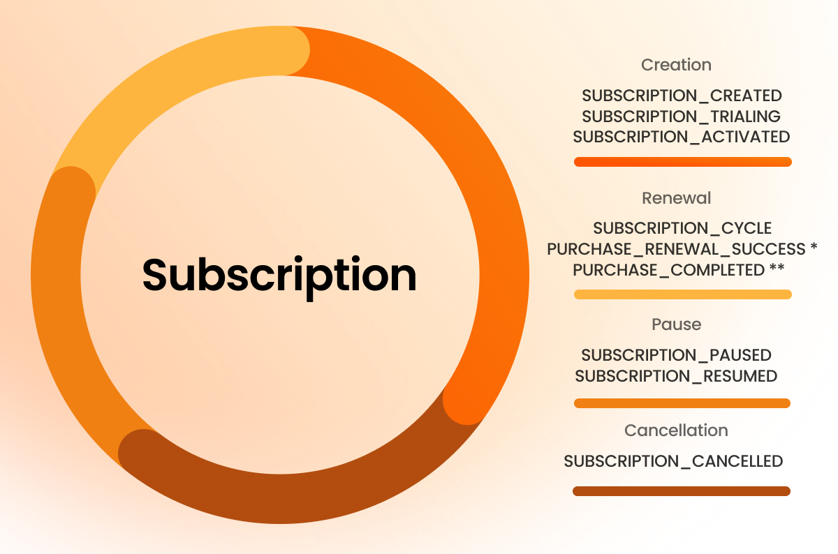 | purchase_completed_success | Payment succeeds. For Mixpanel, this event also indicates renewals. |