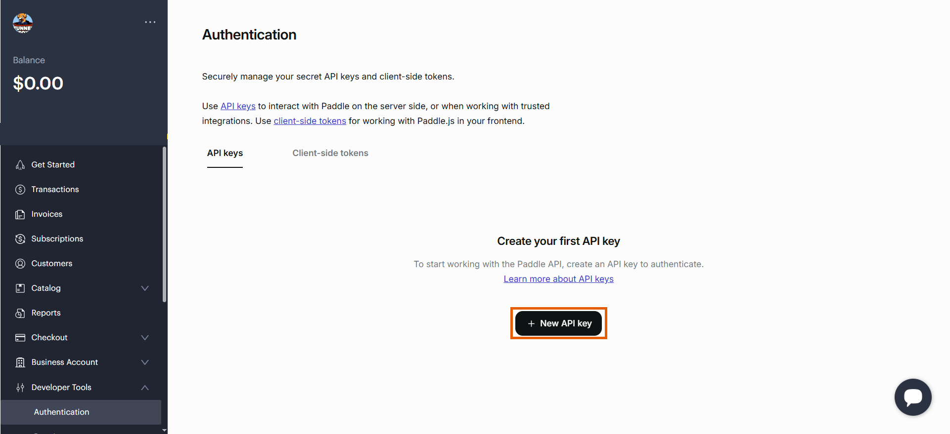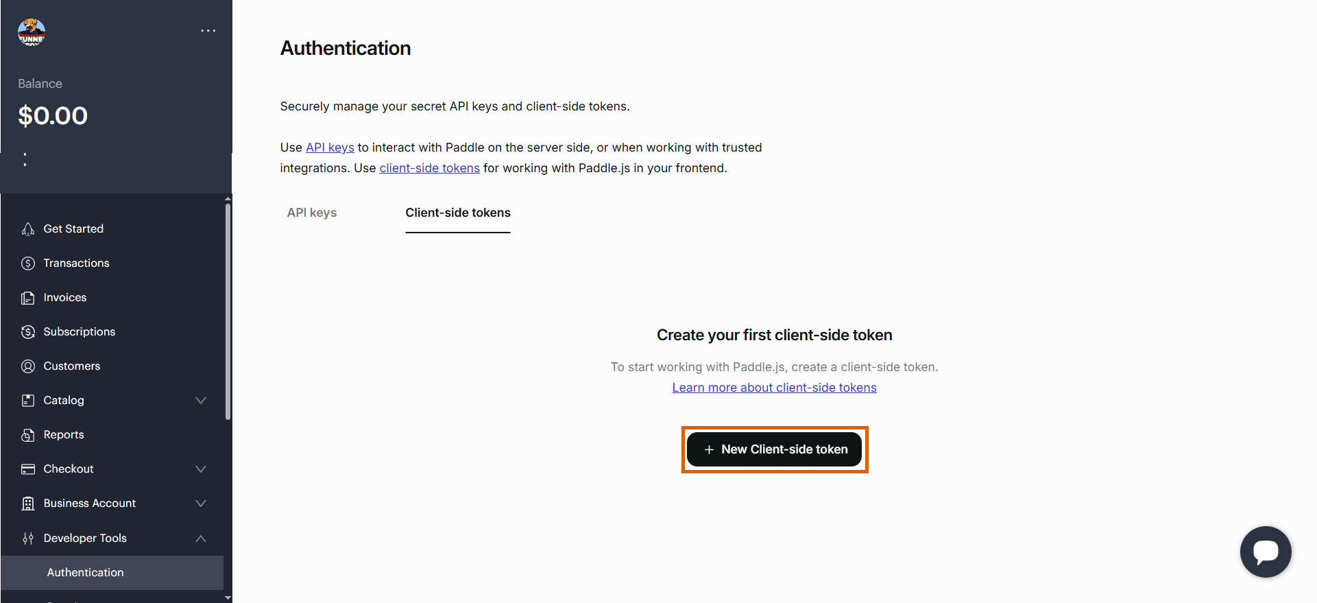 - Go to the Client-side tokens tab of Developer Tools > Authentication in Paddle.