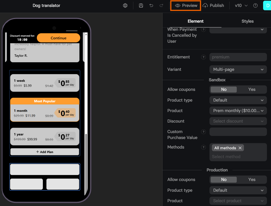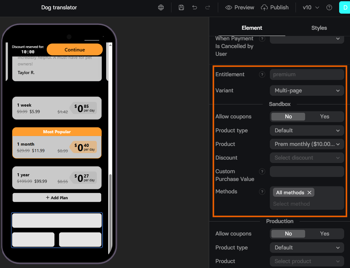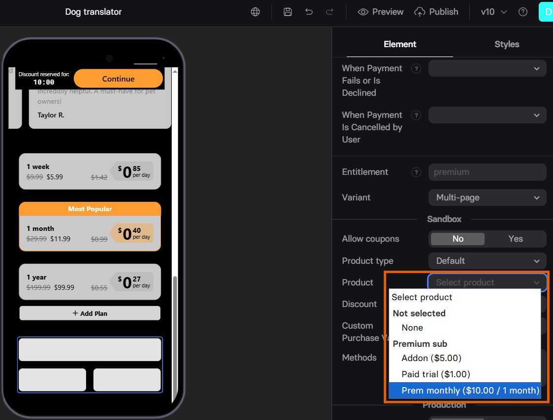 After setup, FunnelFox automatically creates webhooks in your Paddle account and syncs your products. Products created in Paddle become available in the Element tab of your Checkout element. Configure Paddle products in your funnels: