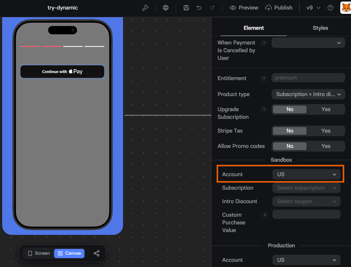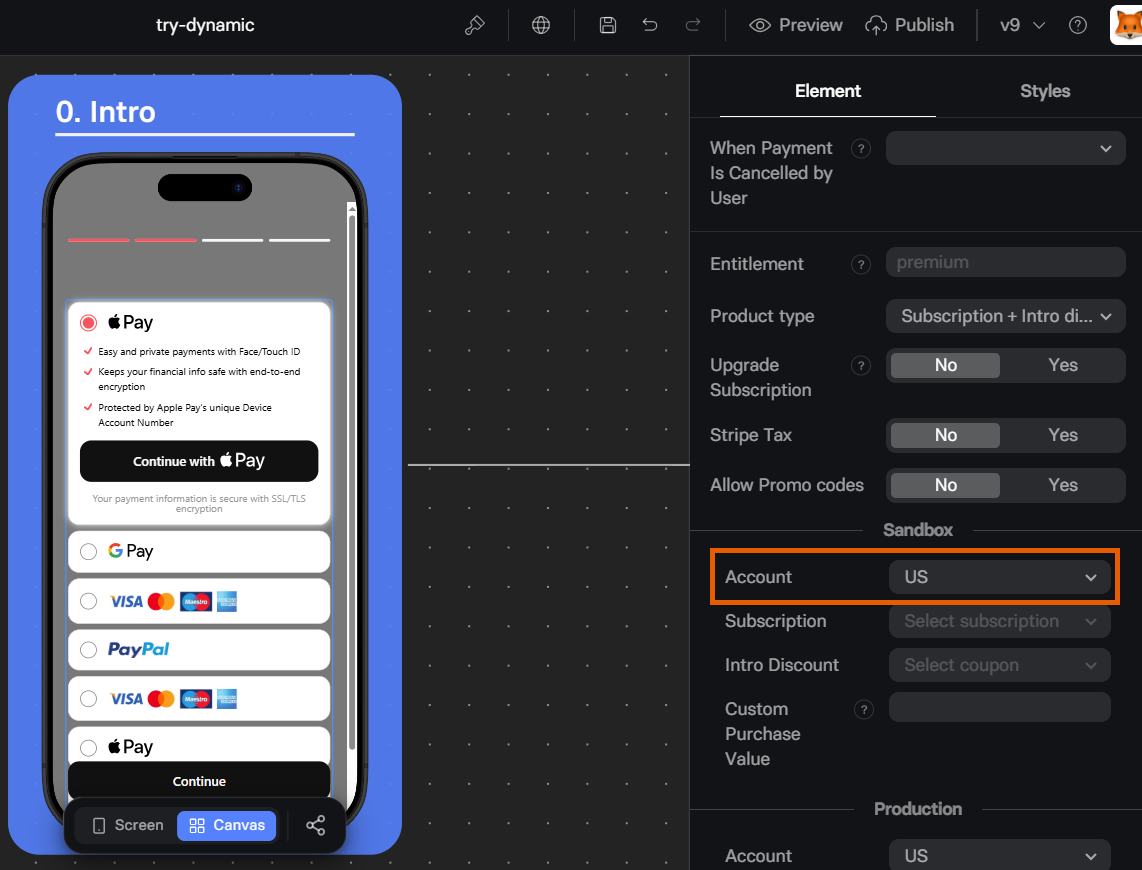 FunnelFox automatically creates webhooks in your Stripe account and syncs your products after setup. Products created in your Stripe Sandbox account are available for funnel preview testing under the Sandbox section of the Element tab in your Checkout element. Similarly, products created in the production environment are available under the Production section. Configure Stripe products in your funnels: