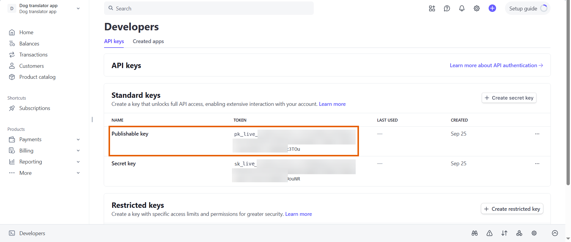 You need to add both publishable and secret keys from your live Stripe account. Publishable key:- Go to Developers > API keys in Stripe Dashboard.