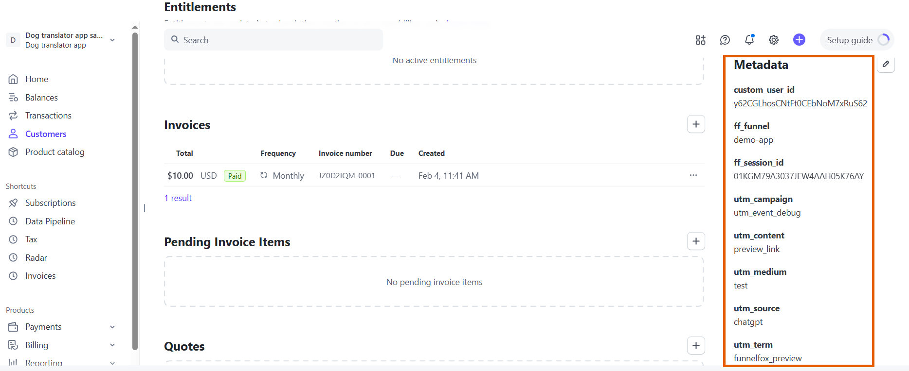 FunnelFox sends the following customer metadata with purchases to Stripe: