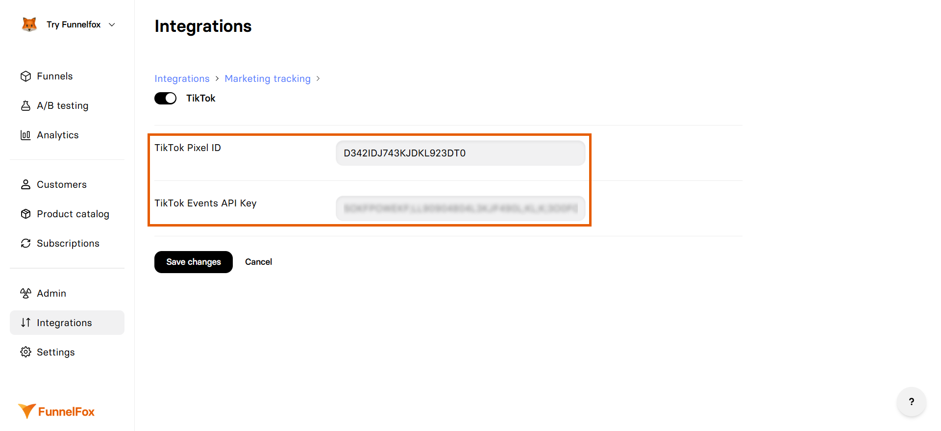 - Go to Integrations > TikTok in FunnelFox.